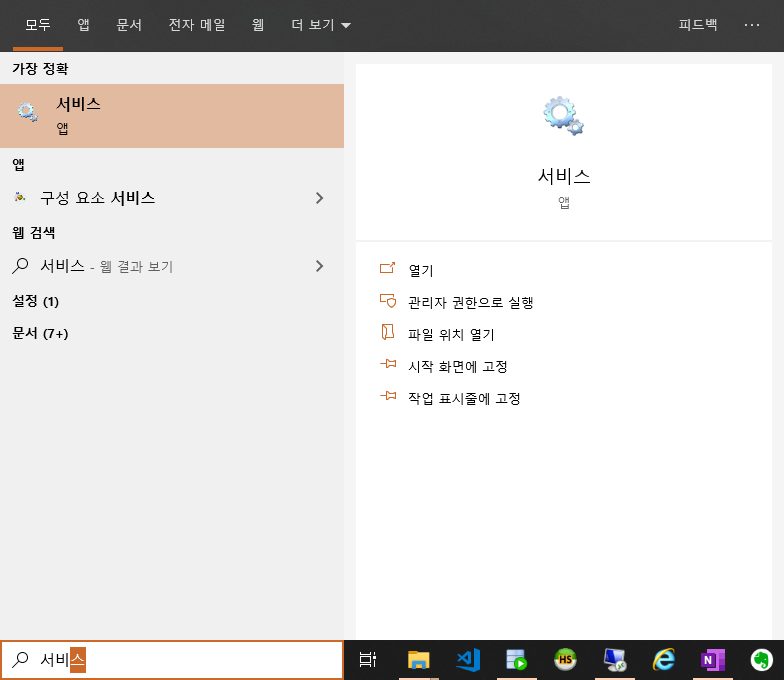 아래 화면과 같이 "services.msc" 를 실행하거나 "서비스""를 검색하여 Windows 서비스 관리자를 열면 된다.