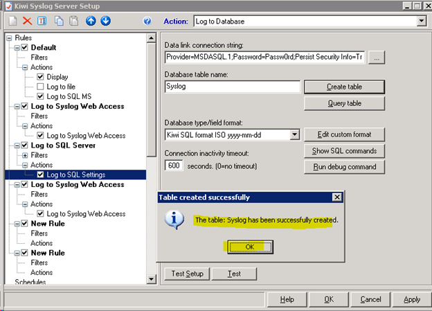 - Create Action in Kiwi Syslog to Store syslogs in MS SQL DB.