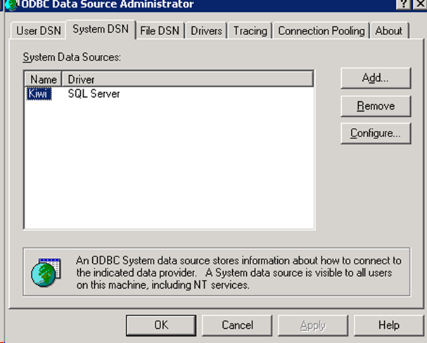 Select the System Data Source, and click Add. Follow the prompts to create the ODBC on Kiwi Syslog Server.