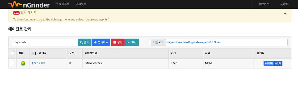 docker run -v ~/ngrinder-agent:/opt/ngrinder-agent -d ngrinder/agent:3.5.3 (ip 주소):8080