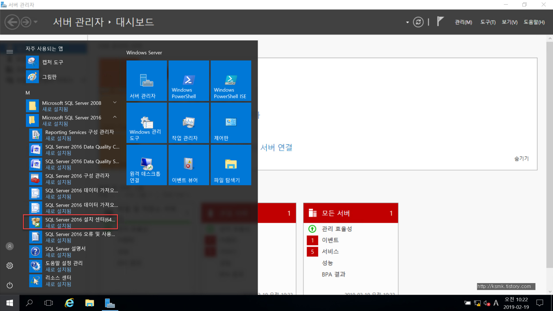 1. 윈도우 키를 눌러 설치된 Microsoft SQL Server 2016 폴더를 확장시켜 MS SQL Server 2016 설치센터를 클릭합니다.