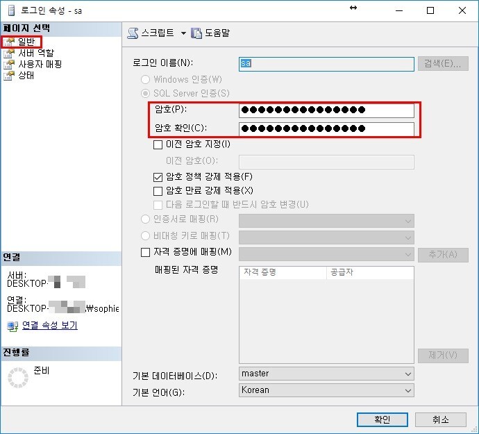 2) “일반” 페이지를 열어 sa 계정의 암호를 입력한다.