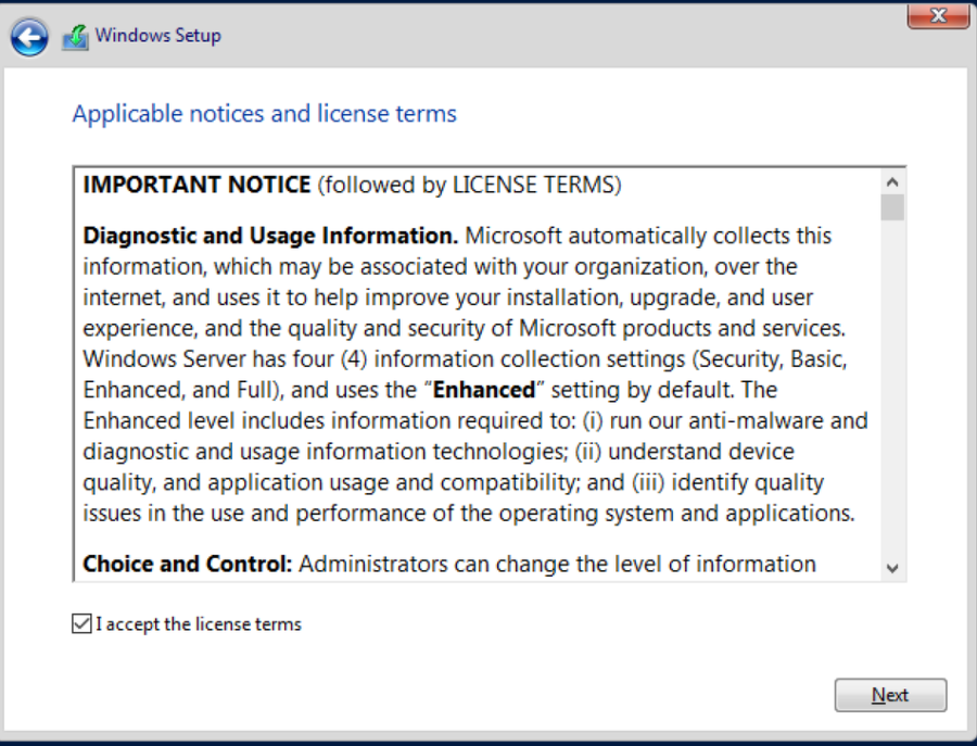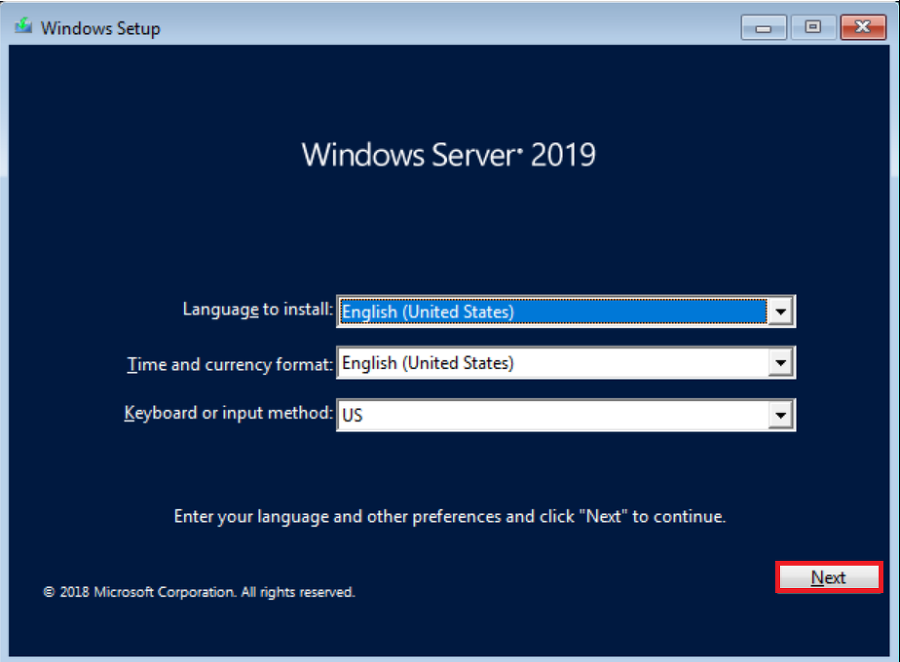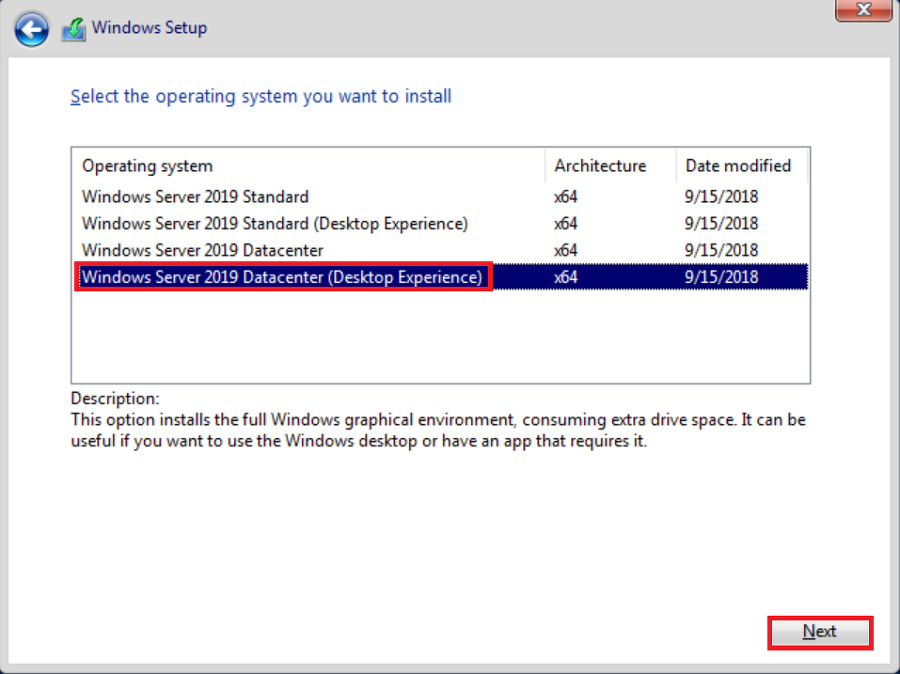 Windows Server 2019 Datacenter (Desktop Experience) 를 선택 후 Next
