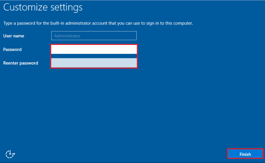 부팅이 완료되면, Built-in Administrator 계정에 대한 Password를 설정한 뒤 Finish