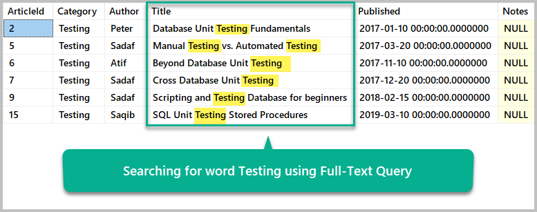 -- Search for the Word Testing using Full-Text Query