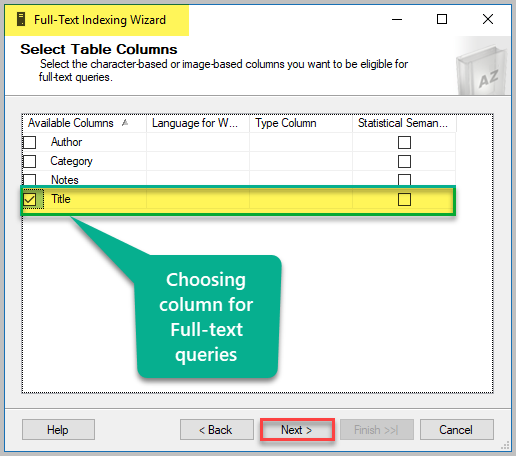 다음 단계에서 전체 텍스트 쿼리에 대한 제목 열을 선택하십시오 . 다음은 전체 텍스트 쿼리를 실행할 열입니다.