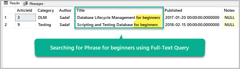 -- Search for Phrase: for beginners using Full-Text Query