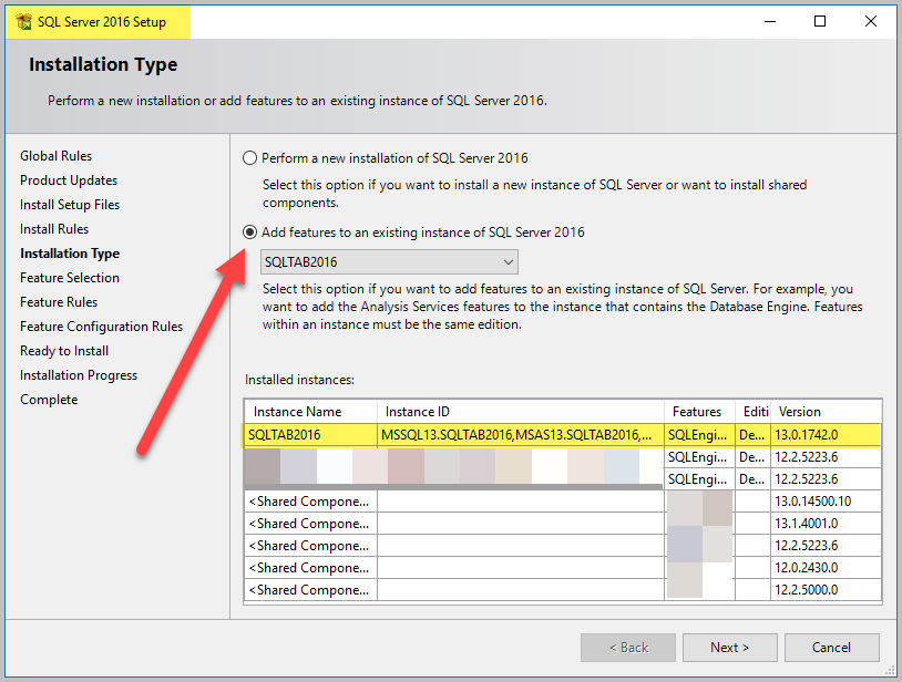 다음으로 전체 텍스트 검색을 설치할 현재 / 잠재 서버를 선택하십시오. 우리의 경우 SQL 2016입니다.