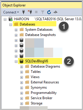 SQL Server의 개체 탐색기 로 이동하여 데이터베이스 노드를 확장 한 다음 SQLDevBlogV6 을 클릭하십시오 .