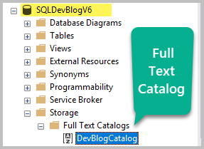 따라서 샘플 데이터베이스 (SQLDevBlogV6)가 작성되고 채워졌습니다. 전체 텍스트 카탈로그를 만드는 것이 전체 텍스트 검색을 구현하는 첫 번째 단계입니다.