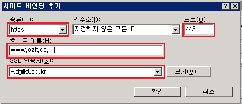 * 호스트 이름 : SSL 레이어를 지정할 사이트 명을 입력합니다. 기존 http의 사이트 바인딩 주소와 동일하게 지정합니다.
