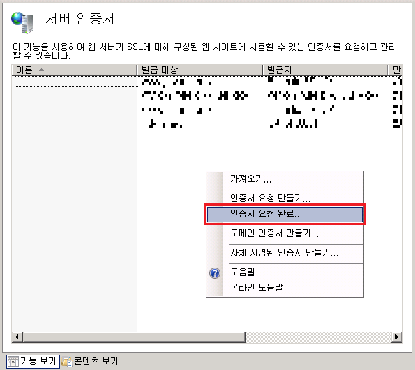 2. 서버 인증서 화면에서, 마우스 우측 버튼을 클릭하면 뜨는 컨텍스트 메뉴에서 '인증서 요청 완료' 메뉴를 선택합니다.