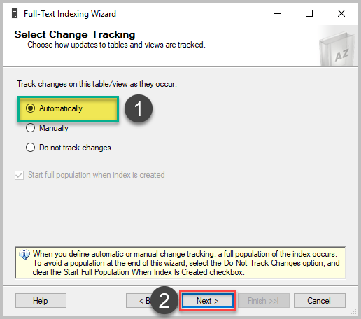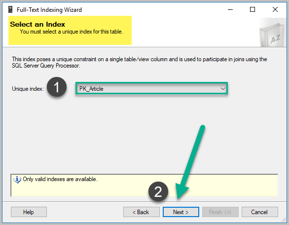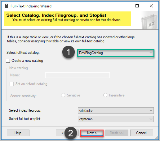 다음 단계에서는이 연습에서 앞에서 정의한 전체 텍스트 색인과 연결할 전체 텍스트 카탈로그 (DevBlogCatalog)를 선택하십시오. 그런 다음 아래와 같이 기본 옵션을 선택한 후 다음을 클릭하십시오.