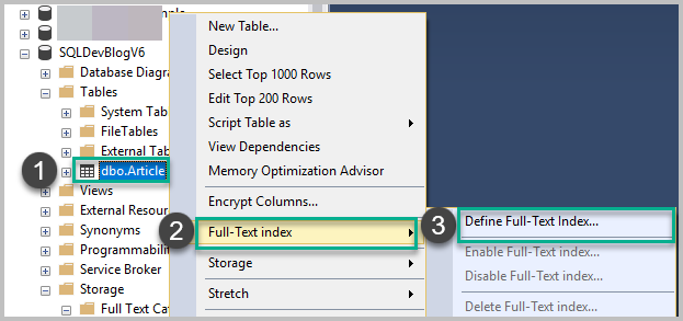 Articles 테이블을 마우스 오른쪽 단추로 클릭하고 전체 텍스트 인덱스 를 클릭 한 다음 아래와 같이 전체 텍스트 인덱스 정의 를 클릭 합니다.