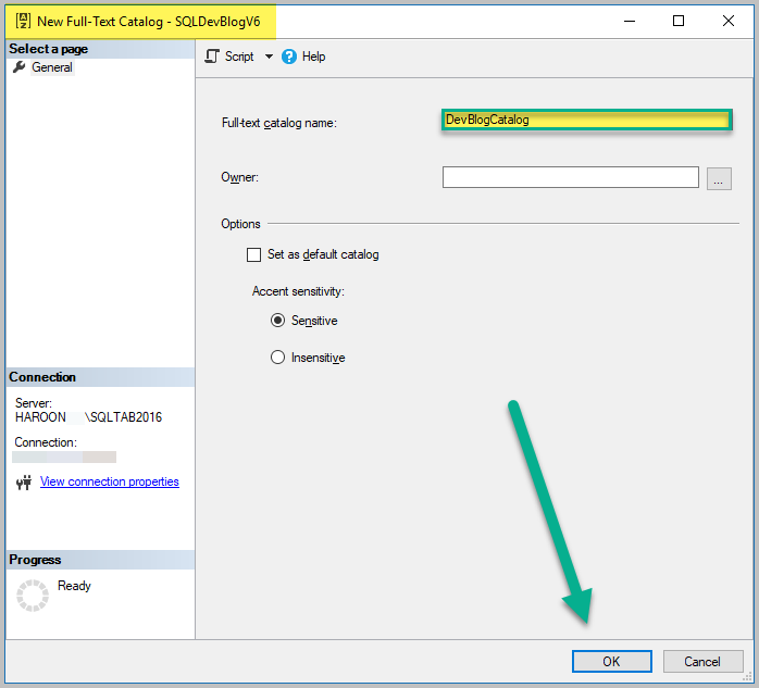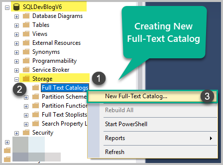 따라서 샘플 데이터베이스 (SQLDevBlogV6)가 작성되고 채워졌습니다. 전체 텍스트 카탈로그를 만드는 것이 전체 텍스트 검색을 구현하는 첫 번째 단계입니다.