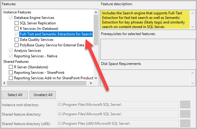 다음으로, 검색 할 전체 텍스트 및 의미 추출 추출 기능을 선택하십시오 (이전 SQL 버전에이 기능을 추가하면 의미 추출이 표시되지 않을 수 있음).