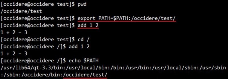 위와 같이 제대로 PATH를 등록했다면 sh 명령어 없이 프로그램 이름인 add만으로도 어느 경로에서나 명령어처럼 사용할 수 있음을 알 수 있다.