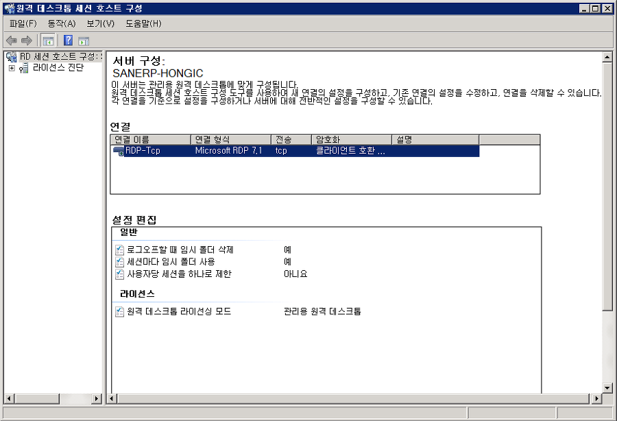 시작 > 관리도구 > 원격 데스트톱 서비스 > 원격 데스크톱 세션 호스트 구성