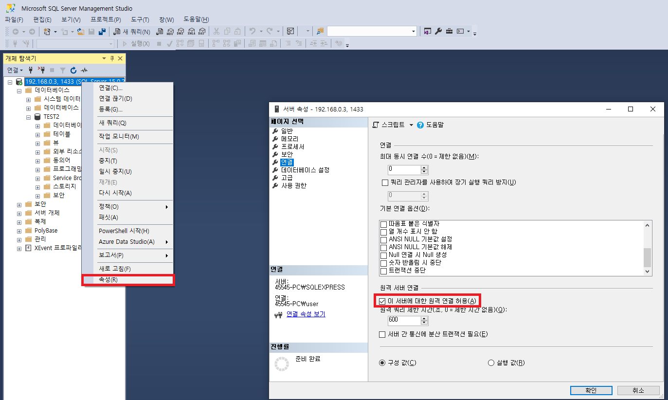 3) 이 서버에 대한 원격 연결 허용 '체크'