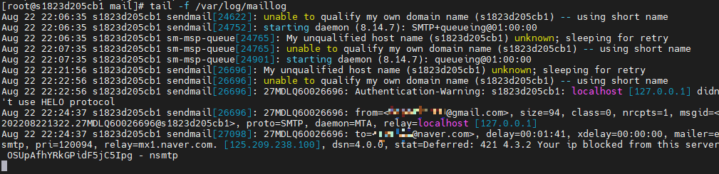 필자의 경우 도메인 설정 오류로 메일 발송 처리가 오래 걸렸고 네이버 메일이 나를 스팸(Spam)으로 간주하여 차단(Block)한 것을 확인할 수 있었다.