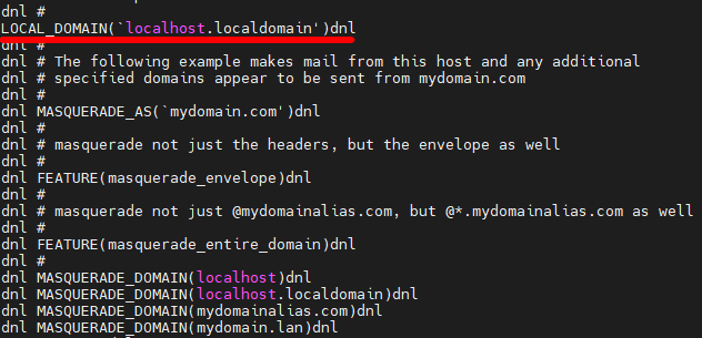 아래와 같은 구문을 찾아서 주석을 해제한다. 'dnl'이 주석을 의미한다. 공백 때문에 설정을 Sendmail이 못 읽을 수 있으므로 주의한다.