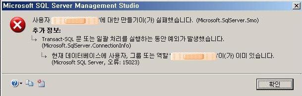 출처 : [SQL] 현재 데이터베이스에 사용자, 그룹 또는 역활 '계정명'이(가) 이미 있습니다. (오류:15023) : 네이버 블로그 (naver.com)