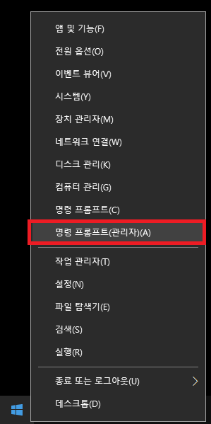 시작 → 우클릭 → 명령 프롬프트(관리자)
