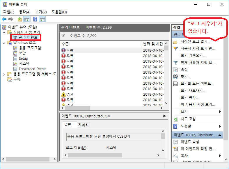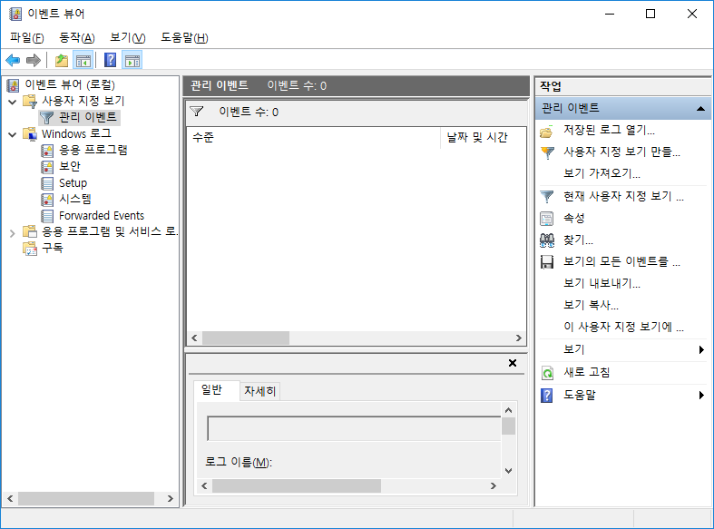 Windows 로그 → "응용 프로그램", "보안", "Setup", "시스템", "Forwarded Events" 선택 → 로그 지우기