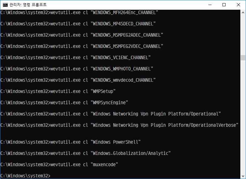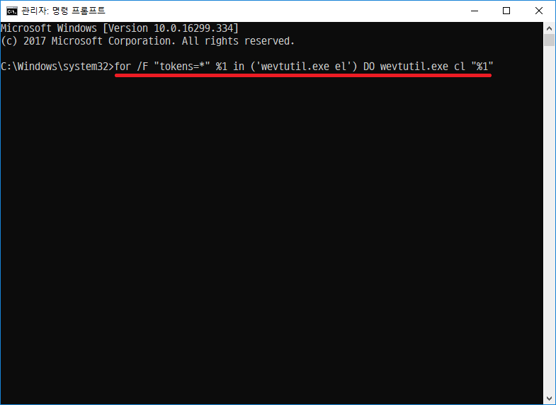 for /F "tokens=*" %1 in ('wevtutil.exe el') DO wevtutil.exe cl "%1" 입력