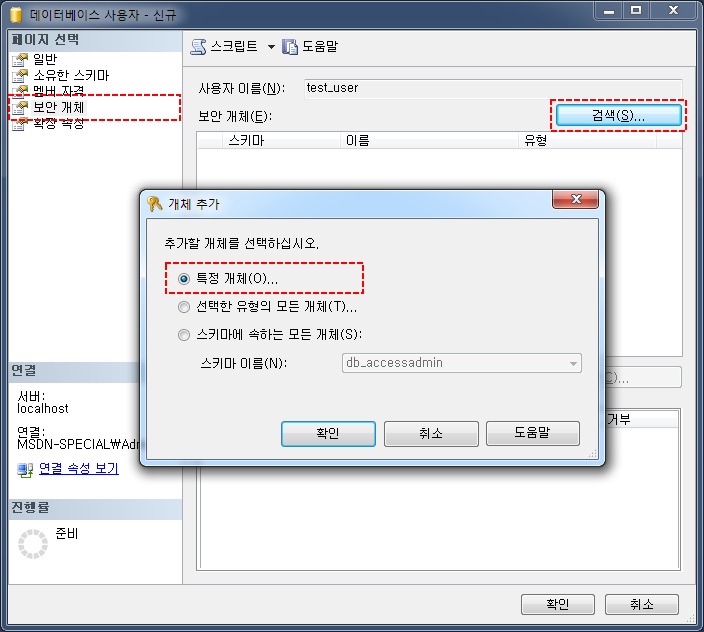 8. 추가된 개체를 선택하시면 사용권한을 추가할 수 있는 화면이 나오게 됩니다. SELECT권한만을 제공하기 위해서 선택을 아래와 같이 선택 후 확인을 누르시면 됩니다.