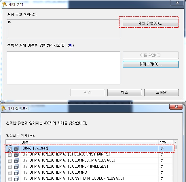 보안 개체를 선택하신 후 검색버튼을 클릭하시면 개체 추가화면에서 특정 개체를 선택 후 확인을 클릭합니다.