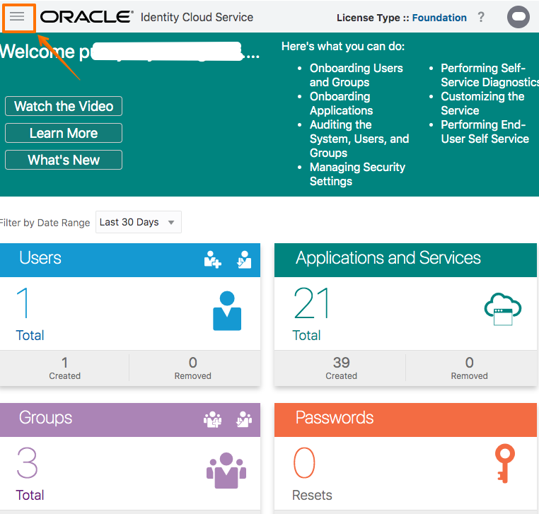 Identity Cloud Service Console 에서 좌측상단 메뉴 아이콘을 클릭 합니다.