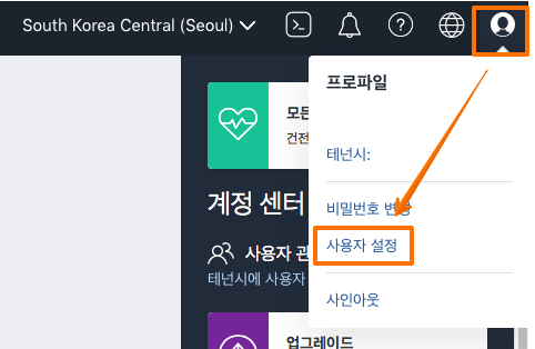 리전명 오른쪽, 화면 우측 상단에 사용자 아이콘 클릭 -> 사용자 설정으로 이동 합니다.