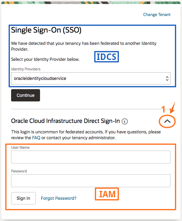 한곳은 IDCS 계정에 대한 로그인 이고 한곳은 IAM 계정에 대한 로그인 입니다.