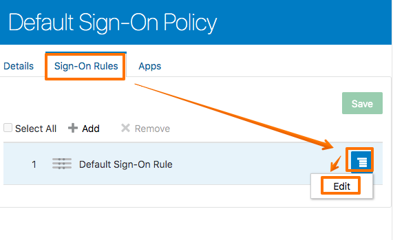 Sign-On Rules -> Default Sing-On Rule 을 Edit 메뉴로 이동 합니다.