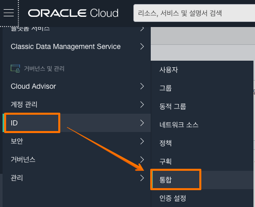 로그인 후 콘솔에서 ID -> 통합 으로 이동 합니다.