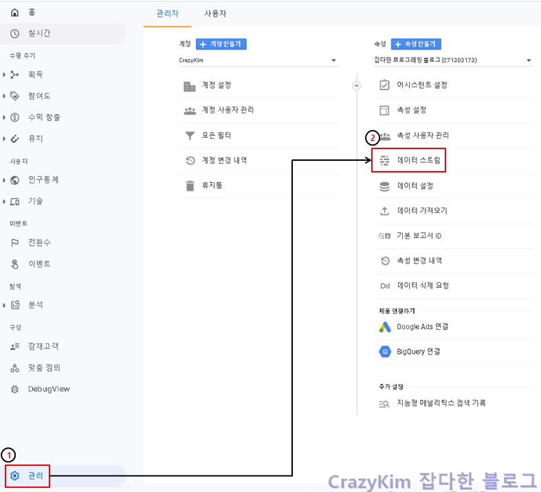 구글 애널리틱스의 왼쪽 메뉴 하단의 "관리"메뉴에 들어갑니다