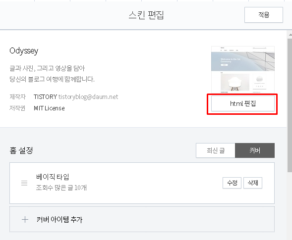 왼쪽 메뉴의 "꾸미기"탭의 "스킨 편집"에 접속합니다