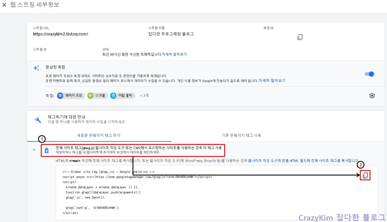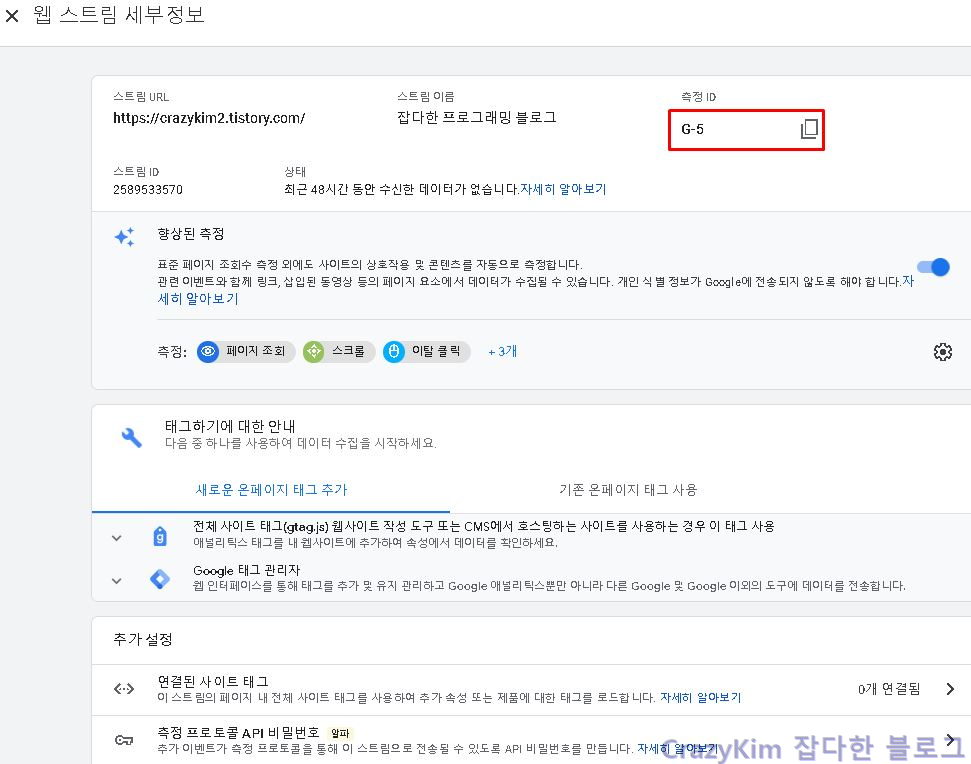 웹 스트림 세부정보에 들어가면 측정ID를 발급받을 수 있습니다
