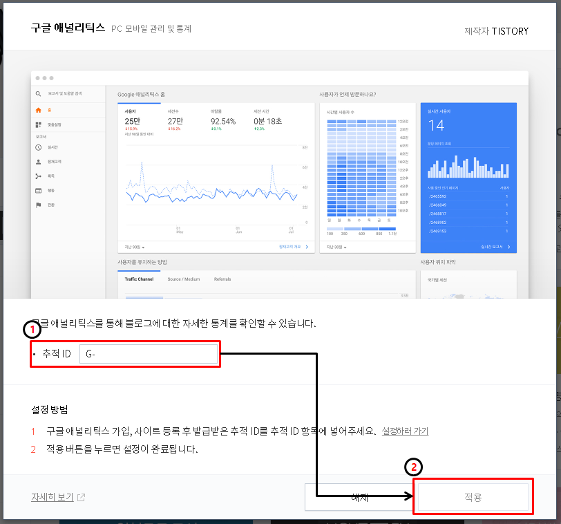 2. "적용"버튼을 눌러서 티스토리 구글 애널리틱스 연동을 마무리합니다!