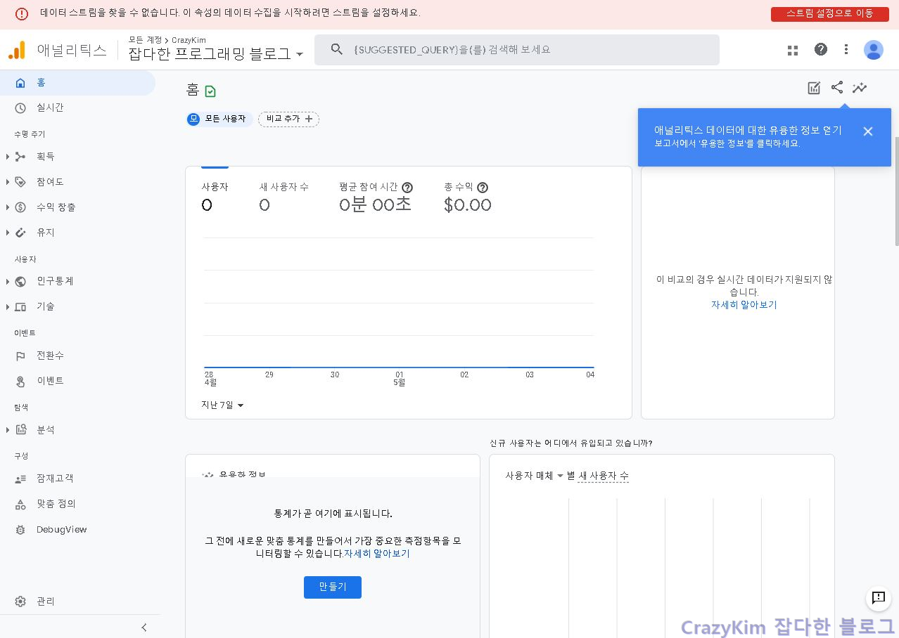 타 블로그의 글들을 보면서 추적ID를 등록했는데 몇 일째 구글 애널리틱스에 데이터가 집계가 안 되더군요...;;