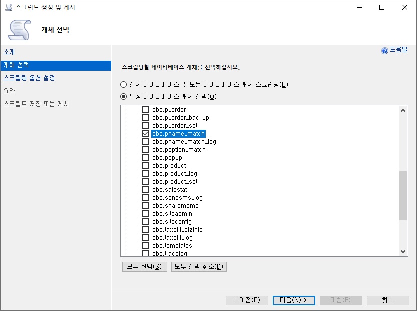 sql 파일로 스크립팅할 개체를 선택합니다. 테이블 단위로 선택할 수 있습니다.