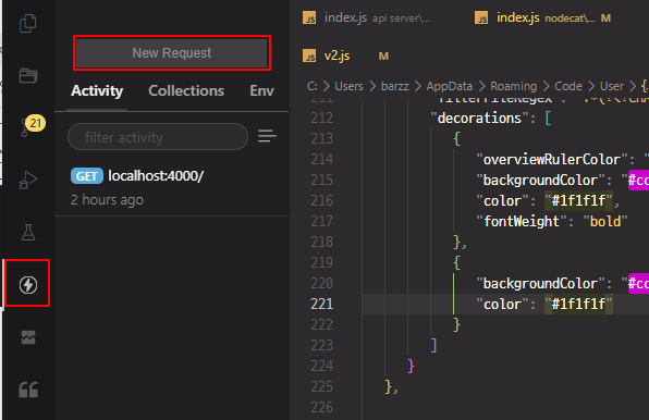 VSCode 익스텐션을 설치하면 좌측 메뉴목록에 번개표시의 썬더 클라이언트 메뉴가 생성된다.