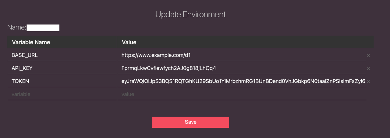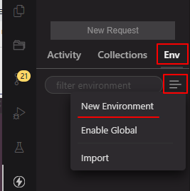상단 Env를 누르고 New Environment를 선택하면 프로젝트마다 환경변수를 적용할 수 있다.