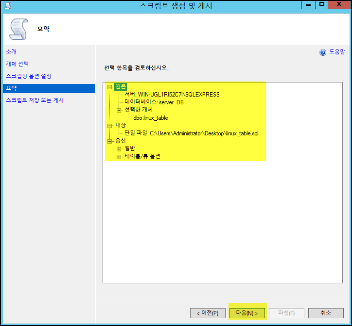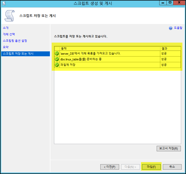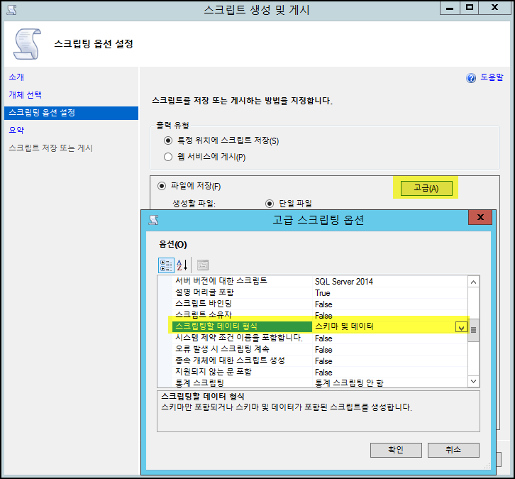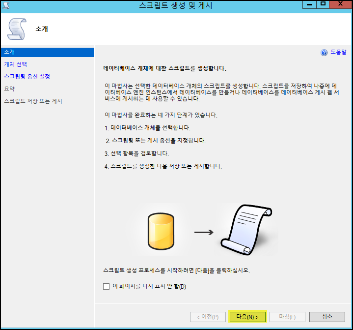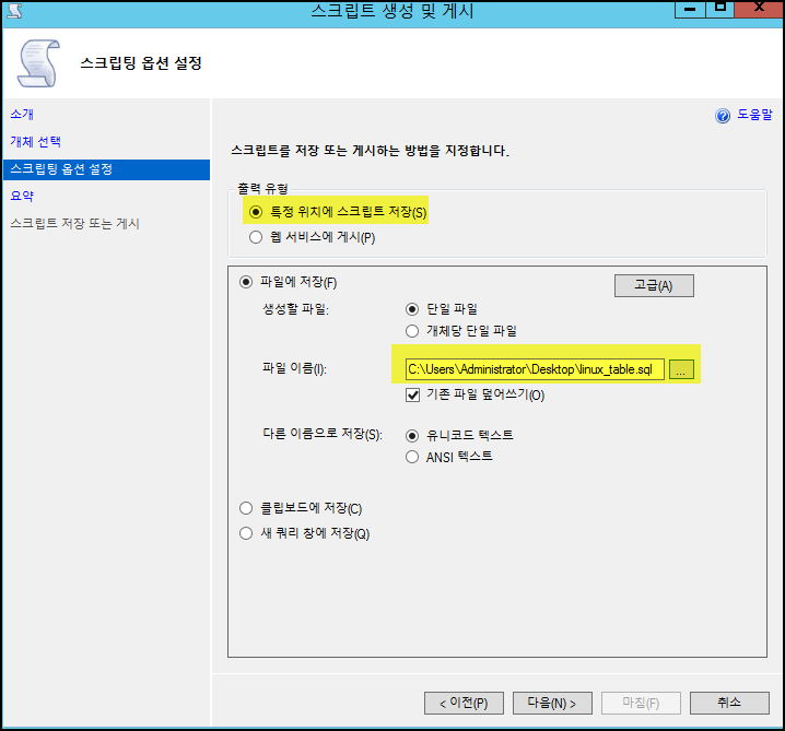 스크립팅 옵션 설정에서 특정 위치에 스크립트 저장 -> 파일에 저장 -> 파일 이름의 경로를 지정 후 다음으로 진행합니다