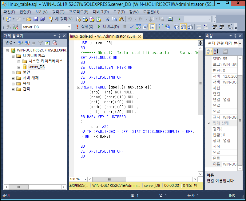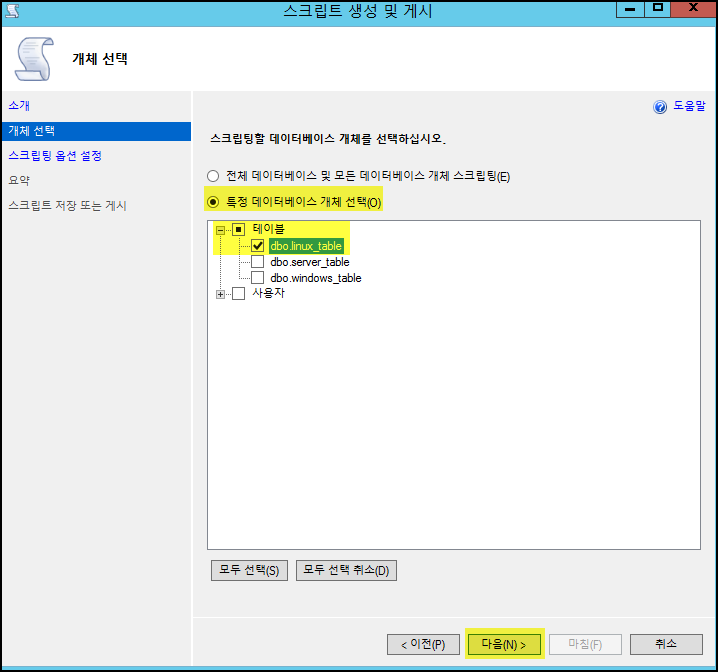 특정 데이터베이스 개체 선택 하신 후 스크립트를 생성할 테이블을 선택합니다