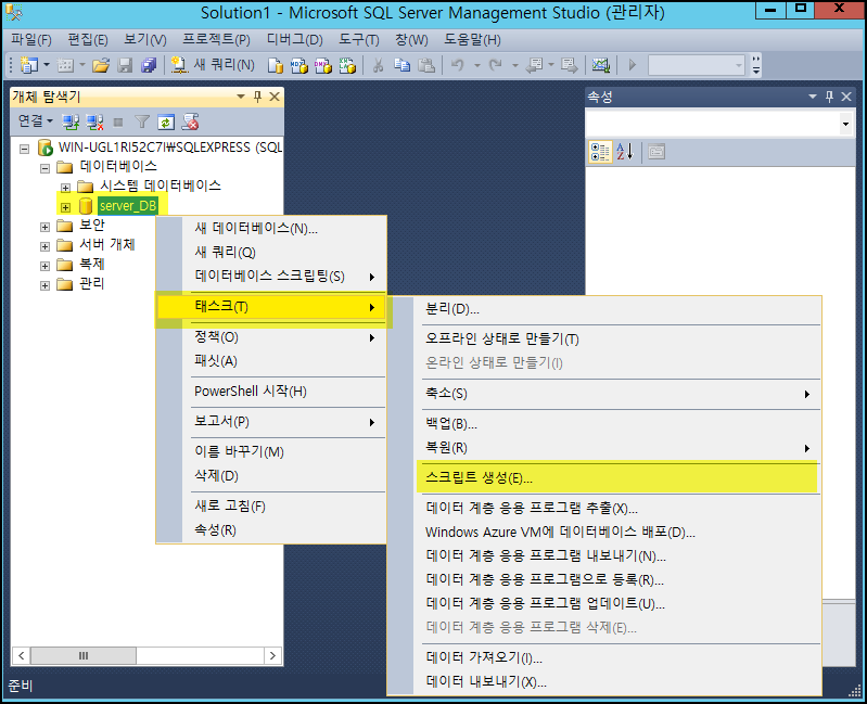 스크립트를 생성할 DB의 우클릭 후 태스크 -> 스크립트 생성 을 선택합니다
