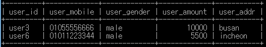 예제 데이터 user_gender 가 'male' 이고 user_amount 가 5500 이상 인 두명의 정보가 출력 되었다.(두가지 조건이 모두 충족되는 정보)