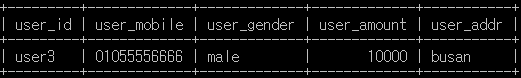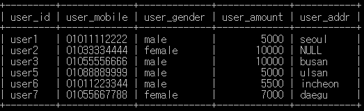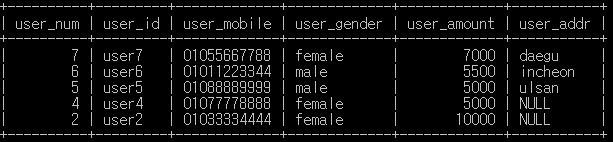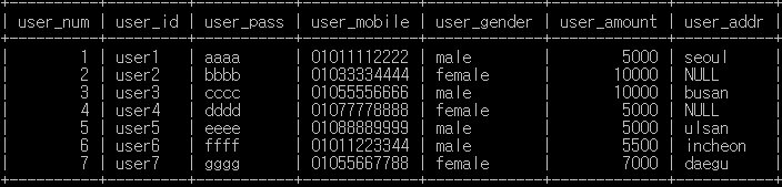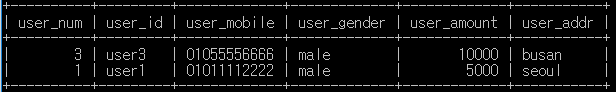 SELECT user_num , user_id , user_mobile , user_gender , user_amount , user_addr