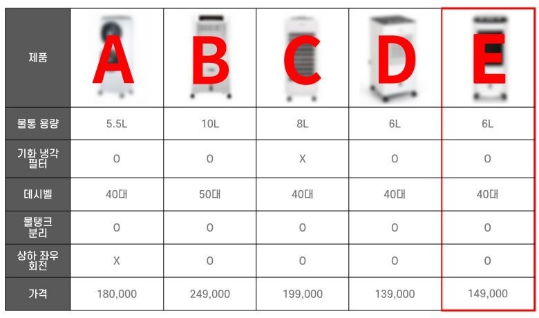 위 표에서 볼 수 있듯이,모든 조건을 충족하는냉풍기는 E제품이 유일했다.